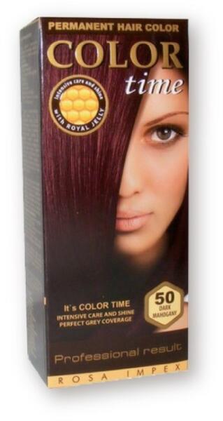 Color Time sötét mahagóni hajfesték 50 Hivatalos magyarországi forgalmazótól. Leírás: Color Time hajfesték tartós hajfesték méhpempővel. A méhpempő regenerálja, hidratálja és vitalizálja a hajat, csillogást és intenzív ápolást nyújt. A Color Time gél formula hihetetlen színállóságot biztosít. Szín pigmentek a zselével kombinálva mélyen behatolnak a haj belsejéb