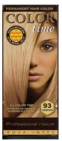Color Time pezsgő hajfesték 93 Hivatalos magyarországi forgalmazótól. Leírás: Color Time hajfesték tartós hajfesték méhpempővel. A méhpempő regenerálja, hidratálja és vitalizálja a hajat, csillogást és intenzív ápolást nyújt. A Color Time gél formula hihetetlen színállóságot biztosít. Szín pigmentek a zselével kombinálva mélyen behatolnak a haj belsejébe ezáltal