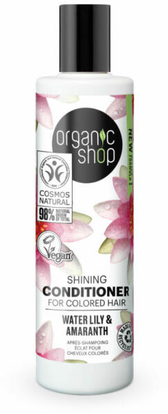 Az Organic Shop Bio Hajkondicionáló Shine vízililiommal és amaránttal tündöklő színt és csillogó fényt ad a festett hajnak. A bio amarántolaj fényessé és élettel telivé varázsolja a festett hajat, megőrzi annak élénk színét. A tavirózsa kivonat táplálja a hajat, helyreállítja és kisimítja annak természetes szerkezetét. A balzsam használatát követően a haj könn