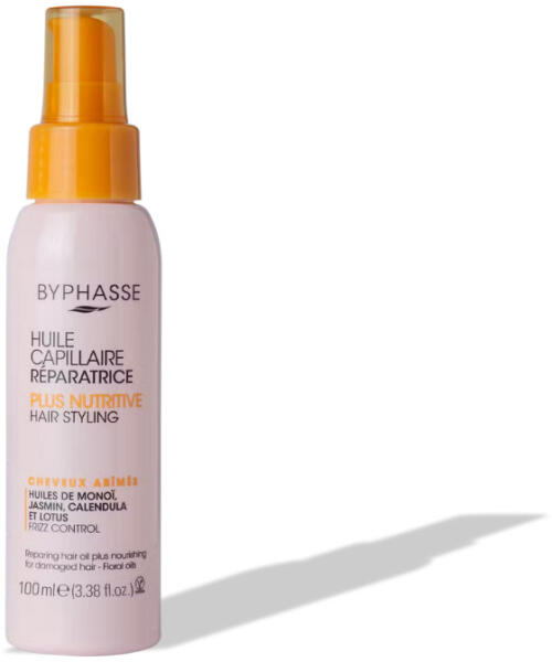 A monoï-val, jázminnal, körömvirággal és lótusszal dúsított Byphasse repairing oil erősíti és puhítja a sérült hajat. Vegán formula, virágolajok, erősítő hatóanyag, nem zsíros textúra. Kiszerelése: 100ml A monoï-val, jázminnal, körömvirággal és lótusszal dúsított Byphasse repairing oil erősíti és puhítja a sérült hajat. Vegán formula, virágolajok, erősít