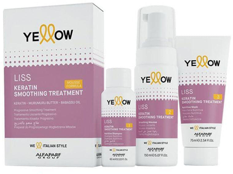 Yellow Liss Keratin Smoothing Kit – 2-3 Alkalomra. Fedezze fel a tökéletesen sima hajat a Yellow Liss Keratin Smoothing Kit-tel, amely egy progreszív keratin kezelés, kompatibilis minden hajtípussal. . Keratinnal és Kera Nutritív komplexummal gazdagítva, amely javítja a haj állapotát, puhábbá és simábbá teszi azt. . A készlet 2-3 alkalmazásra elegendő, így tartós hatást biz