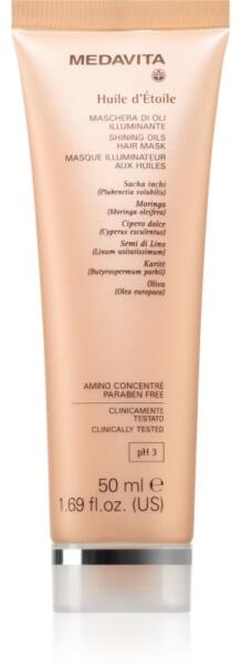 Medavita Huile d'Étolle Shinning Oils Hair Mask, 50 ml, Hajmaszkok nőknek, A minőségi Medavita Huile d'Étolle hajpakolás elengedhetetlenül hozzá tartozik a rituális hajápoláshoz. Kényeztesse haját egy rövid regenerálással és meglátja, hogy vitalitással és szépséggel hálálja majd meg. Tulajdonságok: intenzíven hidratál káprázatos fényt ad a hajnak a haj selymes tapint