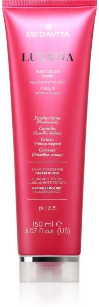 Medavita LUXVIVA Post Color Mask, 150 ml, Hajmaszkok nőknek, Úgy érzi, hogy a hajának intenzívebb ápolásra van szüksége, mint amit a balzsamok vagy kondicionálók nyújtani tudnak? A kiváló Medavita LUXVIVA Post Color Mask hajmaszk remekül színesíti hajápolási rutinját. A speciális problémák megoldását célzó tápláló anyagok magas koncentrációjának köszönhetően vis