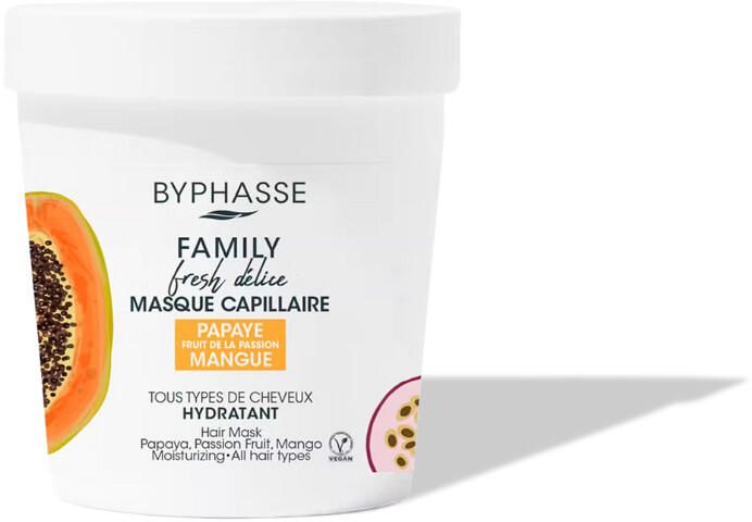 A Byphasse Family Fresh Délice maszk minden hajtípusra mélyen táplál és hidratál, puhává és fényessé varázsolja a hajat. Revitalizáló tulajdonságokkal rendelkező maszk papaya kivonattal, passiógyümölccsel és mangólével. Vegán formula. Bőséges 750 ml-es formátum, az egész családnak! Kiszerelése: 250ml A Byphasse Family Fresh Délice maszk minden hajtípusra mélyen tá