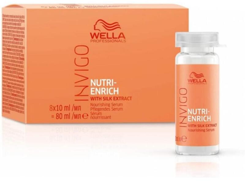 Wella Professionals Invigo Nutri Enrich tápláló szérum roncsolt hajra, 8x10 ml- Öblítést nem igénylő szérum - A károsodott és száraz haj táplálására és regenerálására - A hajszálak egészen a legmélyétől regenerálja - Használatával a haj felülete sima lesz - Fényt és selymességet biztosít az egész frizura számára - E-vitamin tartalma véd a károsodástól és v