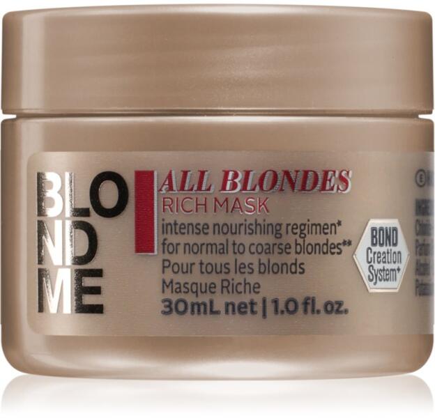 Schwarzkopf Professional Blondme All Blondes Rich, 30 ml, Hajmaszkok nőknek, A minőségi Schwarzkopf Professional Blondme hajpakolás elengedhetetlenül hozzá tartozik a rituális hajápoláshoz. Kényeztesse haját egy rövid regenerálással és meglátja, hogy vitalitással és szépséggel hálálja majd meg. Tulajdonságok: intenzíven hidratál mélyrehatóan kezeli a hajszálakat megúj