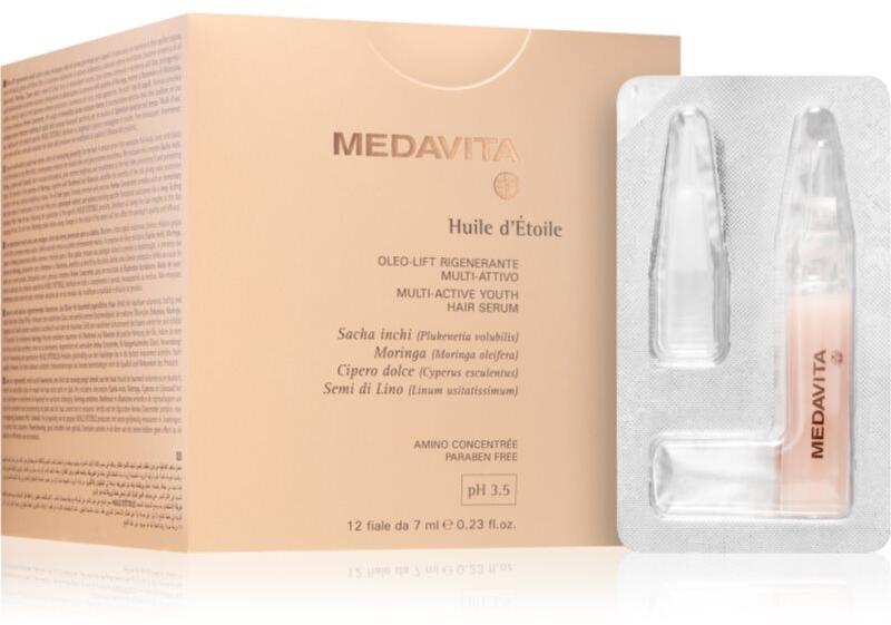 Medavita Huile d'Étolle Multi-Active Youth Hair Serum, 12x7 ml, Hajszérumok nőknek, Szeretne gyönyörű hajat a hajtövektől a hajvégekig, és úgy érzi, hogy a sampon, a kondicionáló vagy akár egy hajpakolás által nyújtott ápolás nem elég? Az ideális Medavita Huile d'Étolle Multi-Active Youth Hair Serum szérum tökéletesen gazdagítja meglévő hajápolási rutinját, és seg
