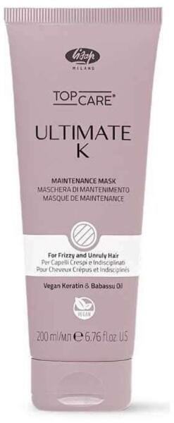 Lisap Top Care Ultimate K utókezelő hajápoló maszk, 200 ml - A Lisap laboratórium legújabb kutatásainak eredménye a Lisap Ultimate K termékcsalád, az innovatív, sokoldalú, vegán, rendkívül hatékony és hosszan tartó professzionális hajvasaló kezelés, vegán keratinnal és babassu olajjal - Fenntartja a kezelés eredményét, a hajat könnyen kezelhetővé és fésülhetővé va