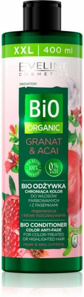 Eveline Cosmetics Bio Organic Granat & Acai, 400 ml, Kondicionálók és balzsamok nőknek, A hajmosás során a sampon megnyitja a haj felszíni szerkezetét – a kutikulát. Ezért fontos, hogy hajmosás után gondoskodjon a haja ápolásáról, hogy a kutikula újra bezáródjon. A kiváló Eveline Cosmetics Bio Organic Granat & Acai kondicionáló pontosan erről gondoskodik. Amellett