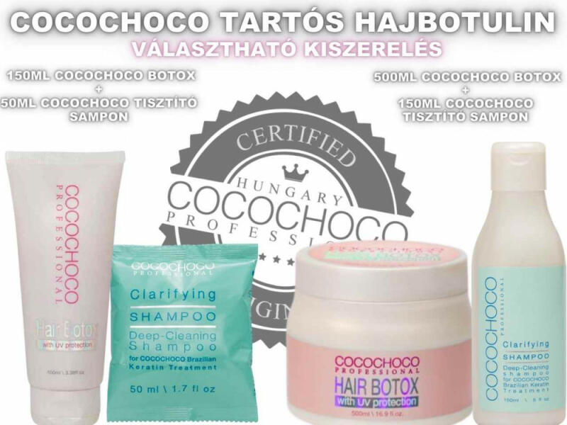 A csomag tartalma: -1db 500ml-es Cocochoco Tartós Hajbotulin -1db 150ml-es Cocochoco Tisztító Sampon Contents of the package: -1pcs 500ml Cocochoco Permanent Hair Botulinum -1pcs 150ml Cocochoco Cleansing Shampoo