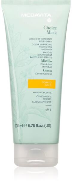 Medavita Choice Gold, 200 ml, Hajmaszkok nőknek, A minőségi Medavita Choice hajpakolás elengedhetetlenül hozzá tartozik a rituális hajápoláshoz. Kényeztesse haját egy rövid regenerálással és meglátja, hogy vitalitással és szépséggel hálálja majd meg. Tulajdonságok: teljes hosszukban regenerálja a hajszálakat megkönnyíti a haj kifésülését és így megelőzi a károsod