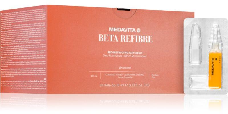 Medavita Beta Refibre Reconstructive Hair Serum, 24x10 ml, Hajszérumok nőknek, Szeretne gyönyörű hajat a hajtövektől a hajvégekig, és úgy érzi, hogy a sampon, a kondicionáló vagy akár egy hajpakolás által nyújtott ápolás nem elég? Az ideális Medavita Beta Refibre Reconstructive Hair Serum szérum tökéletesen gazdagítja meglévő hajápolási rutinját, és segít a kívánt