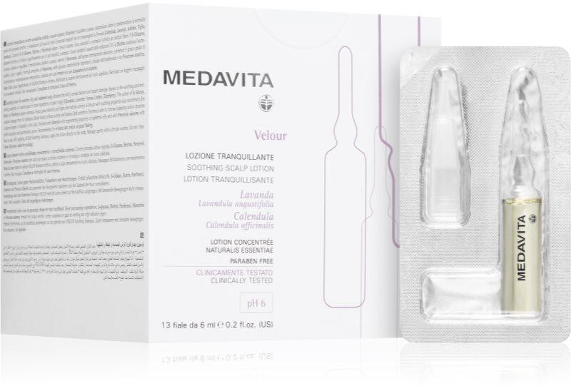 Medavita Velour Soothing Scalp Lotion, 12x6 ml, Hajszérumok nőknek, Az azonnali adag intenzív hidratálásról és táplálásról a remek Medavita Velour Soothing Scalp Lotion öblítésmentes hajápoló gondoskodik. Mindent megad a hajának, amire a hajmosás után szüksége van, anélkül, hogy a szükségesnél több időt kellene a fürdőszobában töltenie. Kisimítja a hajat, és helyr