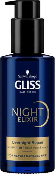 Gliss Night Elixir helyreállító éjszakai hajpakolás HAPTIQ formulával és fekete gyöngy kivonattal, erősen sérült, száraz hajra Regenerálás az éjszaka során & ellenállóbb* & ragyogóbb haj. A HAPTIQ formulájú hajpakolás mikrokötéseket hoz létre a hajban, ezzel erősíti a haj szerkezetét. Gliss Ápolási Skála 3-as fokozat: mélyreható ápolás erősen sérült ha