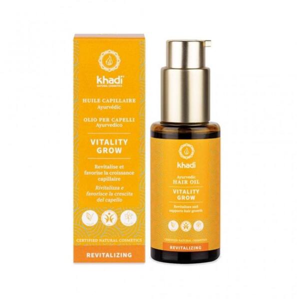 Khadi Vitality Grow ayurvédikus hajolaj, 50 ml - Revitalizálja a hajat és hajgyökereket - Serkenti a hajnövekedést - Megakadályozza a töredezett hajvégek kialakulását és a hajhullást - Ayurvédikus formula szerint készítve - 100%-ban természetes és vegán - Revitalizáld a fejbőröd a tökéletes hajkoronáért! - A Khadi Vitality Grow hajolaj tiszta életenergia a hajad számár