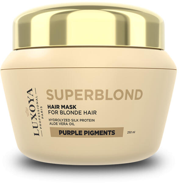 Hajszerkezet helyreállító hajmaszk semlegesítő pigmentekkel száraz és sérült hajra: aloe vera olaj, avokádó olaj Termékleírás A LUXOYA PROFESSIONAL PARIS - SUPERBLOND MASZK mélyrehatóan táplálja és helyreállítja a száraz és sérült hajat, miközben semlegesíti a nem kívánt sárga árnyalatokat! Ez a prémium minőségű hajmaszk különleges összetevőket tartalmaz, mel
