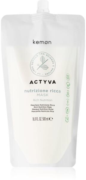 Kemon Actyva Nutrizone Ricca, 500 ml, Hajmaszkok nőknek, A minőségi Kemon Actyva hajpakolás elengedhetetlenül hozzá tartozik a rituális hajápoláshoz. Kényeztesse haját egy rövid regenerálással és meglátja, hogy vitalitással és szépséggel hálálja majd meg. Tulajdonságok: intenzíven hidratál teljes hosszukban regenerálja a hajszálakat a haj selymes tapintásúvá válik k
