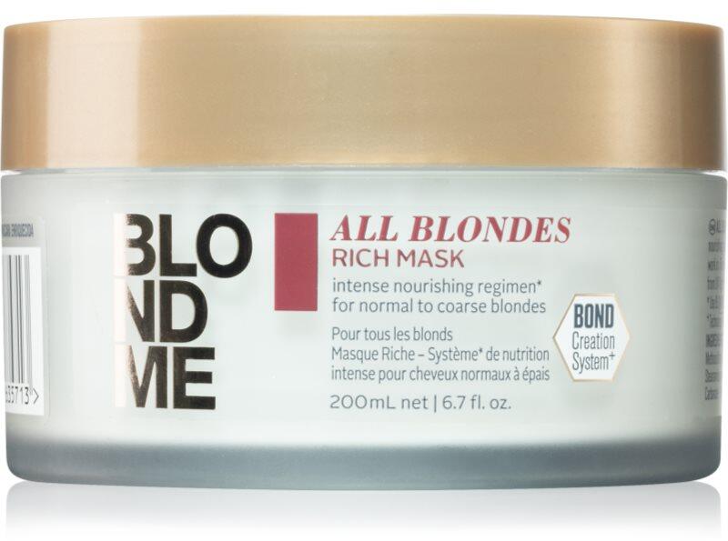 Schwarzkopf Professional Blondme All Blondes Rich, 200 ml, Hajmaszkok nőknek, A minőségi Schwarzkopf Professional Blondme hajpakolás elengedhetetlenül hozzá tartozik a rituális hajápoláshoz. Kényeztesse haját egy rövid regenerálással és meglátja, hogy vitalitással és szépséggel hálálja majd meg. Tulajdonságok: intenzíven hidratál mélyrehatóan kezeli a hajszálakat megúj
