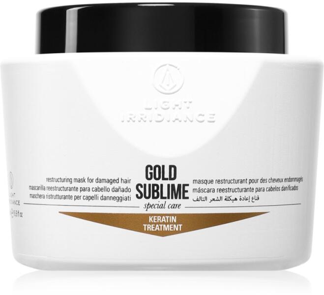 Light Irridiance Gold Sublime, 500 ml, Hajmaszkok nőknek, A minőségi Light Irridiance Gold Sublime hajpakolás elengedhetetlenül hozzá tartozik a rituális hajápoláshoz. Kényeztesse haját egy rövid regenerálással és meglátja, hogy vitalitással és szépséggel hálálja majd meg. Tulajdonságok: intenzíven hidratál teljes hosszukban regenerálja a hajszálakat káprázatos fényt