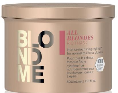 BlondMe All Blondes Rich Mask - tápláló pakolás normál és durva típusú szőke hajhoz, mely intenzíven táplálja és regenerálja a hajat. Helyreállítja a haj rugalmasságát és erősíti a hajszálakat, mialatt kisimítja a haj felületét. Megvédi a hajszálakat a káros környezeti hatásokkal szemben, csillogóan fényes, sima és puha hajat kapunk. Használatával könnyebb kifé
