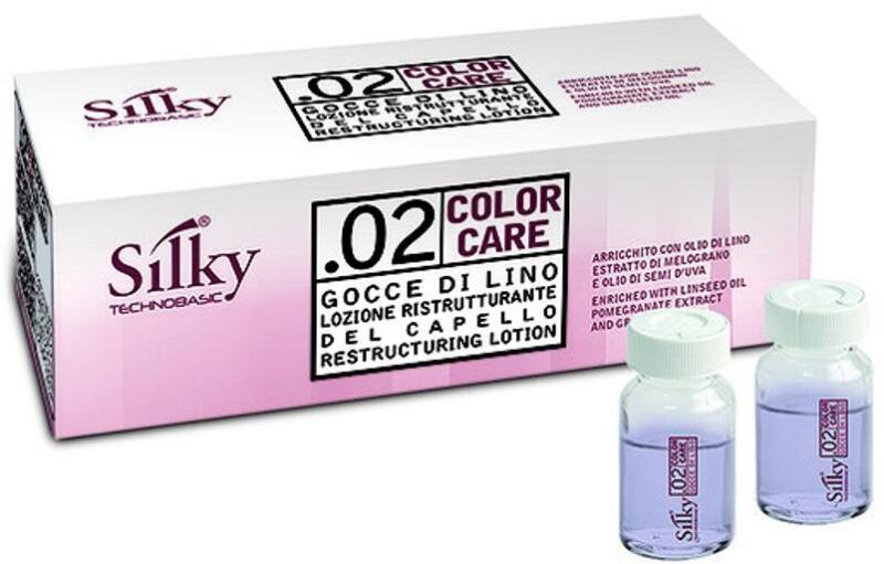 Silky Color Care Gocce Di Lino hajújraépítő ampulla festett hajra, 10x10 ml - Hajban maradó nem kiöblítendő hajújraépítő kezelés - Aktív lenmagolaj és F vitamin tartalommal gazdagított Silky ampulla festett hajra - Puha, selymes, könnyen kezelhető, rugalmas, gubancmentes hajat eredményez - Már az első alkalmazását követően érezhető a Silky kezelés jótékony hatása Kis