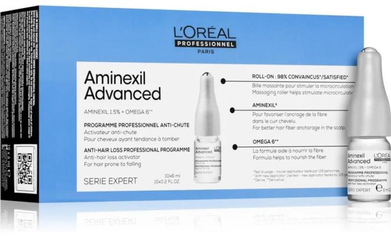 Loreal Professionel Control Aminexil Advanced hajhullásgátló kúra, 10x6 ml - Az Aminexil hatóanyaga segítségével felszabadítja a felgyülemlett kollagéntöbbletet, ezáltal megszünteti a hajhullás okát - Omega-6 nutri complex összetevője táplálja a hajhagymát, így serkenti a haj növekedését Használata: - Hajmosás után alkalmazza az Aminexil Advanced ampullát! - Választé