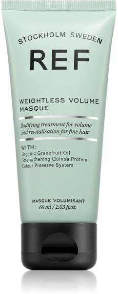 REF Weightless Volume Masque, 60 ml, Hajmaszkok nőknek, A hajpakolás elengedhetetlenül hozzá tartozik a rituális hajápoláshoz. Kényeztesse haját egy rövid regenerálással és meglátja, hogy vitalitással és szépséggel hálálja majd meg. Tulajdonságok: intenzíven hidratál megkönnyíti a haj kifésülését és így megelőzi a károsodását teljes hosszukban regenerálja a hajs