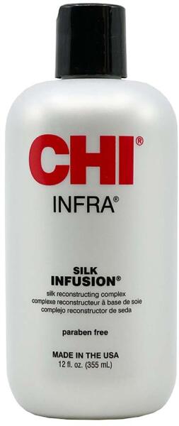 A CHI Silk Infusion selyemkomplexum behatol a haj struktúrájába és dúsítja a szükséges vitaminokkal. Tökéletes fényt ad. A gazdag táplálék kimosás nélkül regenerálja a hajat, védi a hajat a hőhatás és a környezeti szennyeződésekkel szemben. Megkönnyíti a szétfésülést. Aktív anyagok: természetes selyemrészecskéket tartalmaz, gyógynövényekkel, szójaproteinekkel
