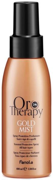 Fanola Oro Therapy Gold Mist, 100 ml - Az illatosított védőpermet - Könnyű gázmentes formuláját nátrium-glükonáttal dúsították, mely megvédi a hajat az olyan külső károsító tényezőktől, mint a szmog, a finom por vagy a nehézfémek- Ideális minden hajtípusra - Hidratálja a hajat- Selymessé és könnyen kifésülhetővé teszi a hajat Használat: - Permetezze a nedves vag