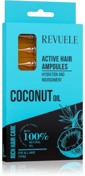Revuele Coconut Oil Active Hair Ampoules, 8x5 ml, Klasszikus hajolajok nőknek, Legyen gyönyörű a haja a hajtövektől egészen a hajvégekig! A minőségi szérum tökéletesen ápolja haját és új életet lehel bele. Tulajdonságok: fényt ad a hajnak bársonyosan selymessé teszi a hajat mélyrehatóan táplálja a hajat erőssé és rugalmassá teszi a hajat észrevehetően szebbé teszi