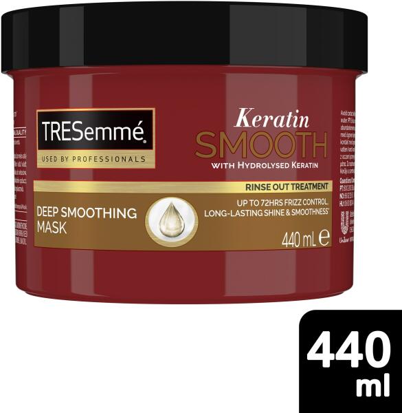 TRESemmé Keratin Smooth hajpakolás, 440 ml ÖsszetevőkAquaCetearyl AlcoholStearamidopropyl DimethylamineDimethiconeBehentrimonium ChlorideParfumDipropylene GlycolLactic AcidAmodimethiconeDisodium EDTASodium ChloridePhenoxyethanolPEG-7 Propylheptyl EtherCetrimonium ChlorideMagnesium NitrateHydrolyzed KeratinSclerocarya Birrea Seed OilArgania Spinosa Kernel OilMethylchloroisothiazolinoneMagnesium
