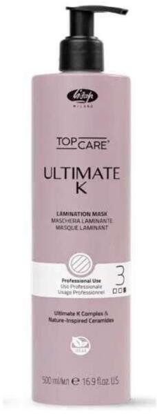 Lisap Top Care Ultimate K lamináló maszk Step 3, 500 ml - A Lisap laboratórium legújabb kutatásainak eredménye a Lisap Ultimate K termékcsalád, az innovatív, sokoldalú, vegán, rendkívül hatékony és hosszan tartó professzionális hajvasaló kezelés, vegán keratinnal és babassu olajjal - Intenzíven laminálja, mélyen táplálja a hajat, segít a szöszösödés és szárazság e