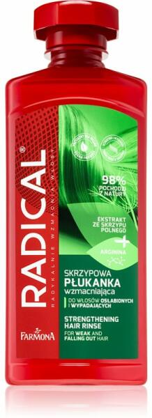 Farmona Radical Strengthening Hair Rinse, 400 ml, Kondicionálók és balzsamok nőknek, Tulajdonságok: regenerálja a hajszálakat selymességet és vitalitást ad a hajnak helyreállítja a hajszálakat helyreállítja a hajszálak szerkezetét Használata: Vigye fel a samponnal megmosott hajára. Ne öblítse le, és formázza haját a megszokott módon.