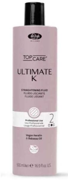 Lisap Top Care Ultimate K hajegyenesítő fluid Step 2, 500 ml - A Lisap laboratórium legújabb kutatásainak eredménye a Lisap Ultimate K termékcsalád, az innovatív, sokoldalú, vegán, rendkívül hatékony és hosszan tartó professzionális hajvasaló kezelés, vegán keratinnal és babassu olajjal - Hő segítségével átalakítja a keratinláncokat a hajban, finomítja, puhítja őket