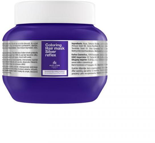 Kallos Silver Reflex színező hajpakolás 275gr emlegesíti és hamvasítja a szőkített, szőke vagy ősz haj nemkívánatos sárgás színét. A haj visszanyeri természetes fényét és ezüstös tónusát. Az ezüst árnyalat intenzitása fokozatosan erősödik többszöri felhasználás után. Regeneráló és hidratáló hatású Keratin hatóanyag tartalmának köszönhetően újjáépít