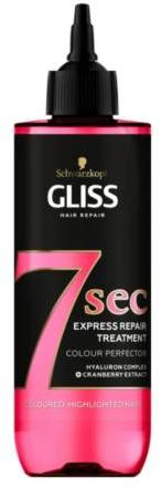 Gliss 7seconds express repair hajpakolás, Ragyogó szín és védelem, 200ml Folyadékból krémmé alakuló Gliss Express Repair 7seconds Ultimate Repair hajpakolás a hajfestés által károsodott hajra. A magas koncentráltságú, erős összetevőket tartalmazó formula szempillantás alatt biztosítja a regenerálást, fényes és sima hajat eredményez. Hajpakolás hajfestés által károso