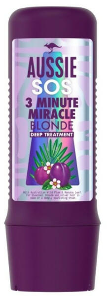 Aussie SOS 3 Minute Miracle Blonde Hair vegán intenzív kondicionáló vadszilvával és manukalevél-kivonattal a táplálást igénylő szőke hajra. Aussie SOS 3 Minute Miracle Blonde Hair vegán intenzív kondicionáló 225 ml HATÉKONY ÖSSZETEVŐK: Aussie SOS Blonde 3 Minute Miracle ausztrál vadszilvával és manukalevél-kivonattal CSODÁT TESZ A HAJJAL: hidratálja és táplálja a szők