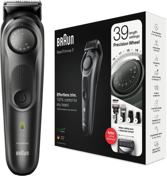 A Braun BT7 férfi szakáll- és hajvágóval könnyedén létrehozhatja saját stílusát. Ez a szakállvágó élesebb, gyorsabb és hatékonyabb – szélesebb a vágófelülete, ezért minden mozdulattal több szőrszálat ragad meg és vág le (a korábbi Braun szakállvágókhoz képest). A Beard Trimmer 7 39-féle hosszbeállítást lehetővé tévő precíziós gombbal, élethosszig tartó