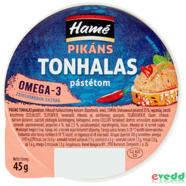 Termékleírás Jellemzők Omega-3 zsírsavakban gazdag, A termék csípős Előírt terméknév Pikáns tonhalas pástétom. Hőkezelt halkészítmény-konzerv. Összetevők Ivóvíz, Tonhal (Katsuwonus pelamis) 25%, Repceolaj, Ízesítő készítmény (szójaliszt, tejfehérje, keményitő, étkezési só, sűrítőanyag: guargumi, tojásfehérje, fűszer, ízfokozó: nátrium-glutamát, szárí