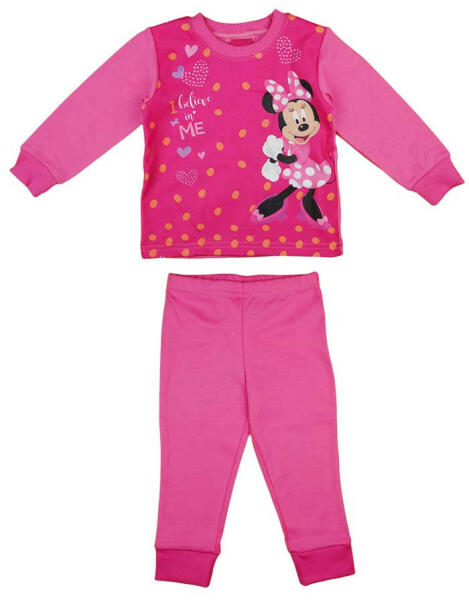 Öltöztesd kislányodat kedvenc Disney karakterének, a Minnie egérnek a képével díszített pizsamába! Ez a két részes pizsama tökéletes választás a mindennapokra, hiszen puha, 100% pamut anyagának köszönhetően kényelmes viseletet biztosít. A pizsama felsőjén Minnie egér aranyos mintája látható, míg a nadrág gumis derekának köszönhetően könnyen felvehető és kényel