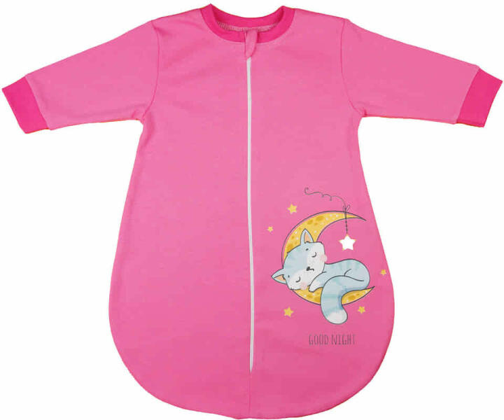 Varázsoljon édes álmokat a kicsinek ezzel a hosszú ujjú, vékony pamut hálózsákkal, melyet bájos cica mintával díszítettünk. A világos pink színű hálózsák elöl cipzárral rendelkezik, így könnyűszerrel felvehető és levehető, mindezt kényelem és praktikum mellett. A minőségi, 100% pamut anyagból készült termék, gondoskodik gyermeked éjszakai kényelméről, garant