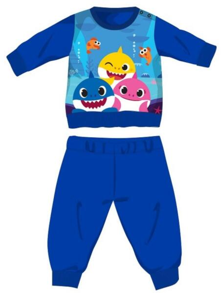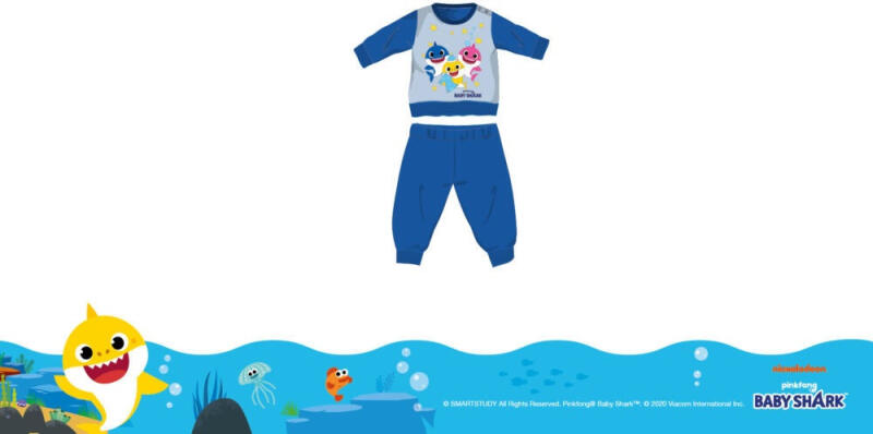 Baby Shark téli interlock pizsama babáknak 100% pamut alapanyagból. Kényelmes bőrbarát viselet. Gombos nyakkialakítással, gumírozott derékrésszel, egyenes, szűkített szárral, Baby Shark mintával. Méret: 80 Díszdobozban szállítjuk.