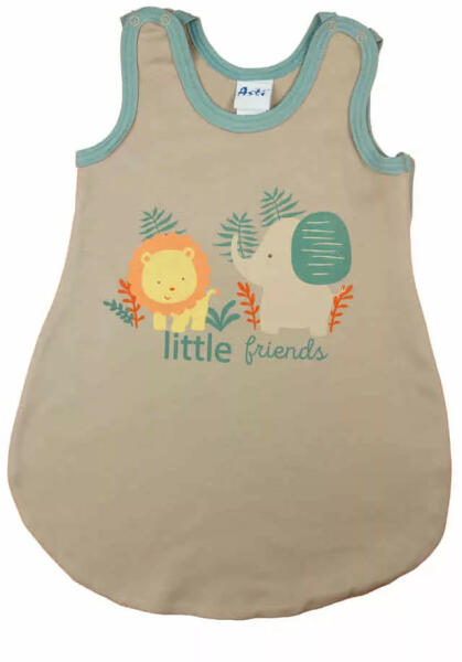 Ujjatlan vékony pamut hálózsák Szafaris mintával 1 TOG Szafaris mintával nyomott, oldalt cipzáras, vállon patentos vékony pamut anyagból készült ujjatlan hálózsák. Minőségi magyar termék Anyaga: 100% pamut Minőség: I. osztály A termék nikkelmentes patenttal készül. A patent nem tartalmaz nikkelt, ezért nem vált ki allergiás reakciót az erre érzékeny babáknál.