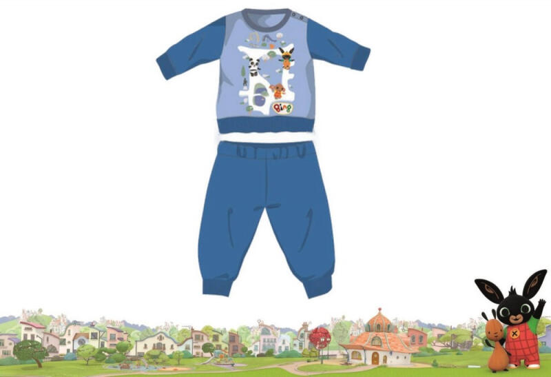 Bing nyuszi téli interlock pizsama kisfiúknak 100% pamut alapanyagból. Kényelmes bőrbarát viselet. Gombos nyakkialakítással, gumírozott derékrésszel, egyenes, szűkített szárral, Bing nyuszi mintával. Méret: 86 Díszdobozban szállítjuk.