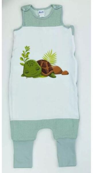 Ujjatlan pamut tipegő hálózsák egy édes Teknős mintával 2 TOG vastagsággal. Egy igazi kis kalandra indulhat a gyermeked ezzel a gyönyörű, halványzöld színű cuki teknős mintával nyomott tipegő hálózsákkal. Az ujjatlan, vállon patentos, oldalán szétcipzározható, 2 rétegű hálózsák nemcsak kényelmes, de praktikus is. A lábrésze könnyedén felhúzható, így a pici go