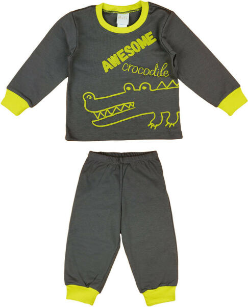 Egy kis kalandra vágysz az álomvilágban? Itt a tökéletes választás a kis felfedeződnek! A szürke alapszínű, krokodilos mintával dombornyomott pizsama garantáltan a gyermeked kedvence lesz. A pizsama felső és nadrág együttese kényelmes viseletet biztosít, így gondoskodik a nyugodt éjszakai pihenésről. A 100% pamut anyagból készült pizsama minőségi, első osztályú magya