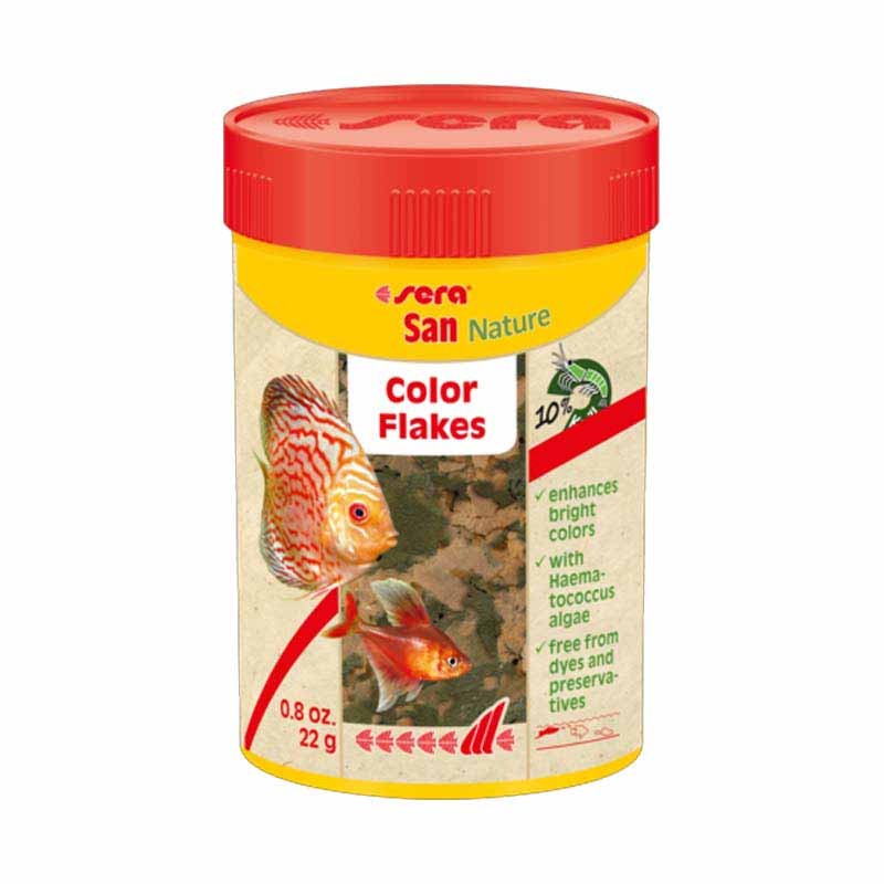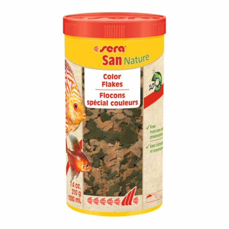 Sera San Nature színezőtáp, amely 10% Krill pelyhekből áll a természetes színfejlődés érdekében. A sera San Nature a színezékek, színezékek és tartósítószerek nélkül, minden díszhal számára, amely a víz felszínén eszik. A színfejlődést kizárólag olyan természetes összetevők fokozzák, mint az Asztaxantinban gazdag Haematococcus alga és a Krill. Ugyanakkor fokozz