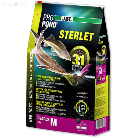 Termék részletekJBL ProPond Sterlet M 3,0kg/ 6l Komplett eledel közepes méretű kecsegéknek -Teljes értékű takarmány magas állati eredetű tápanyag tartalommal - NEOIndex: helyesprotein-zsírarány 3 :1 -4 évszakos: 10-25 c víz hőmérsékletre , bármely életkorra -40% fehérje , 12 % zsír , 2 % nyersrostot és8 %hamu -Szemcseméret:M( 6mm ) halak mérete 3 0-60cm . -Kis élelmiszer gyöngyök vissz