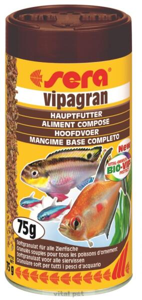 Termék részletekSERA Vipagran 250 ml A sera vipagran egy teljesen újfajta lágy granulátum gondosan kiválogatott és kíméletesen feldolgozott nyersanyagokból. A sera vipagran valamennyi fontos vitamint, ásványi anyagot és esszenciális nyomelemet tartalmaz. A stabilizált C vitamin megnöveli az ellenálló képességet és erősíti az immunrendszert. A lágy konzisztencia és a könnyű fogyaszthatós