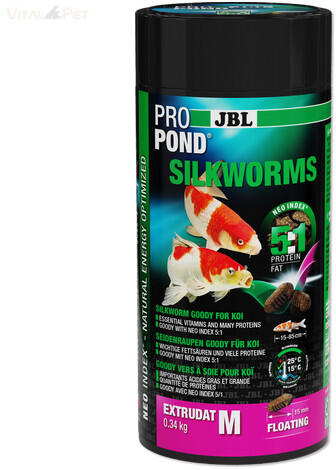 Termék részletekJBL ProPond Silkworms M: Selyemhernyó csemege koiknak. Teljes értékű táplálék, optimális fehérje-zsír aránnyal. Egészséges és erősíti a halakat. JBL ProPond Silkworms M – A koi halak igazi csemegéje! A JBL ProPond Silkworms M egy prémium minőségű, extrudált selyemhernyó táplálék, kifejezetten koik számára. Ez a különleges csemege nemcsak ízletes, de számos előnny